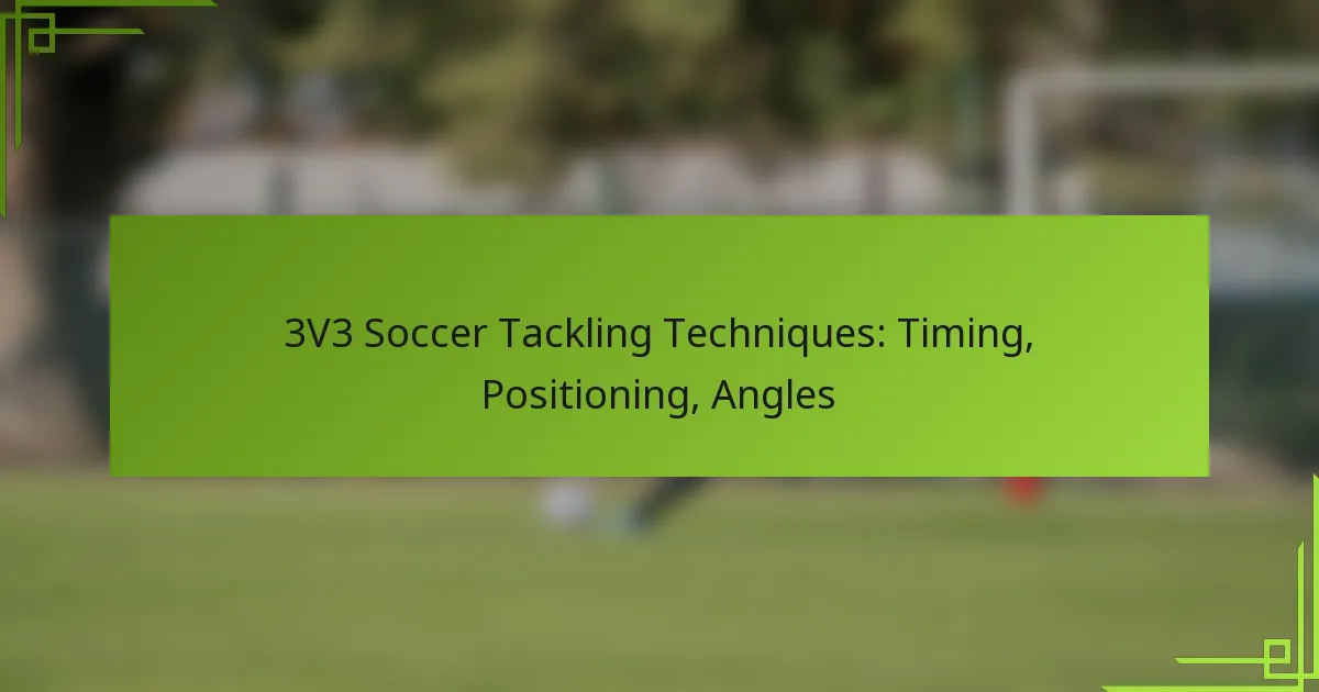 Key tackling techniques in 3v3 soccer include timing, positioning, and utilizing angles effectively. Mastering these elements can significantly enhance a player’s ability to regain possession and disrupt the opponent’s play.